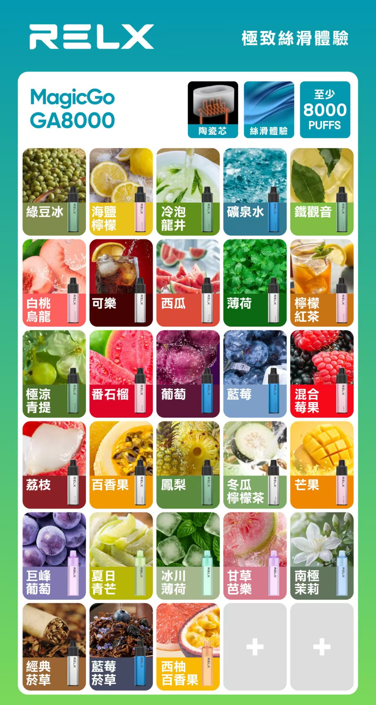 RELX GA8000拋棄式​​是悅刻最新推出的​​高端台灣一次性電子煙​​,採用​​陶瓷霧化芯+透明油倉​​設計,提供​​8000口​​穩定吸感,RELX GA8000​​無需充電,用完即棄,完美解決傳統一次性電子煙​​漏油、焦味、續航短​​等問題,為用戶帶來前所未有的順滑吸感和真實還原的口味體驗。